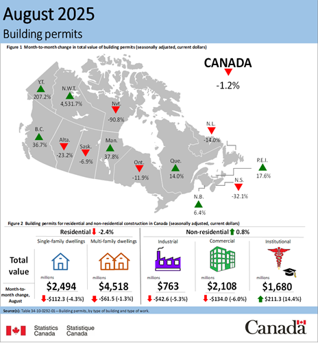 The total value of building permits issued across the country dropped by $139.2 million (-1.2%) to $11.6 billion in August.