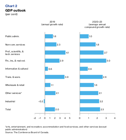 Finally, the news is positive for Toronto’s professional services sector, which is expected to grow by 4.1 percent in 2019 and 2.2 percent in 2020. The Conference Board points to massive expansion plans by Shopify in the GTA (the company plans to double its employee base by 2022), as well as a planned spend of $500 million to occupy space at the Well development. Other investments are also forecast from Uber and Salesforce.