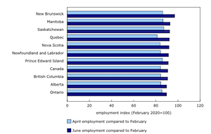 As a result, all provinces recorded increases in employment and decreases in COVID-related absences In June. Ontario led the way with a jump in employment of 378,000—or 5.9 percent. It was the province’s first increase since the pandemic began. The proportion of employed people who worked less than half of their usual hours declined by 6.5 percentage points to 14.1 percent, while the province’s unemployment rate declined 1.4 percentage points to 12.2 percent as the number of people on temporary layoff declined.