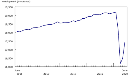 The national unemployment rate fell to 12.3 percent in June. That represented a drop of 1.4 percentage points from May’s record high of 13.7 percent. Statistics Canada reports that although the drop was the largest monthly decline ever recorded, the unemployment rate remains well above February’s figure of 5.6 percent.