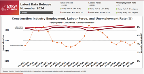 The November data from Statistics Canada’s Labour Force Survey (LFS) suggest that construction activity across the country could be slowing ahead of the winter months. Compared with October 2024, November’s industry unemployment rate is up 0.6 percentage points while employment is down 0.8%.
