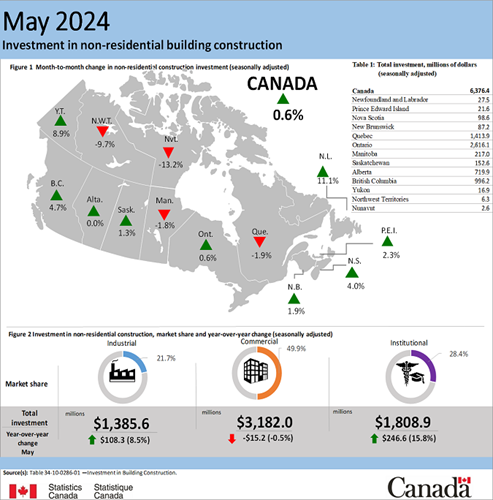 Investment in non-residential construction rose slightly in May, increasing 0.6% to $6.4 billion. Growth in both the commercial (+$28.9 million to $3.2 billion) and institutional (+$17.3 million to $1.8 billion) components was tempered by investment declines in the industrial component (-$6.2 million to $1.4 billion).