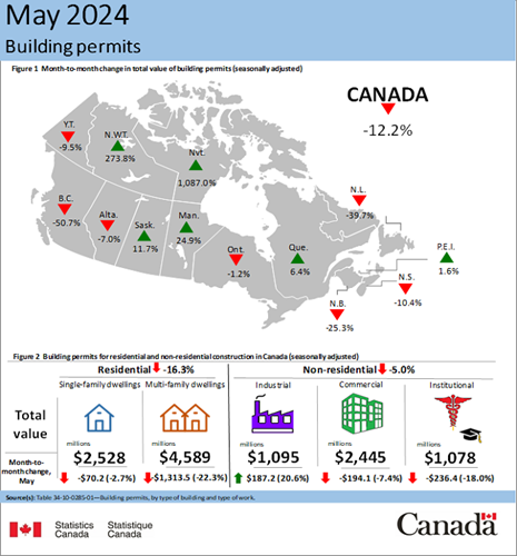 The value of residential building permits fell 16.3% to $7.1 billion in May. British Columbia (-53.7%; -$1.1 billion) drove the decline in May following an unusually strong April, led by a record high value of multi-unit permits in the province.
