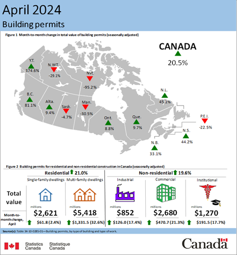 Meanwhile, the value of non-residential permits increased 19.6% to $4.8 billion in April 2024, with growth in the commercial (+21.3%; +$470.7 million), institutional (+17.7%; +$191.5 million) and industrial (+17.4%; +$126.0 million) components.
