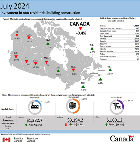 Investment in the commercial component edged down 0.4% (-$11.7 million) to $3.2 billion in July. Declines were posted in five provinces and two territories, led by Quebec (-$9.6 million) and Alberta (-$4.8 million). These declines were moderated by increases in six provinces and territories, driven by British Columbia (+$6.0 million).