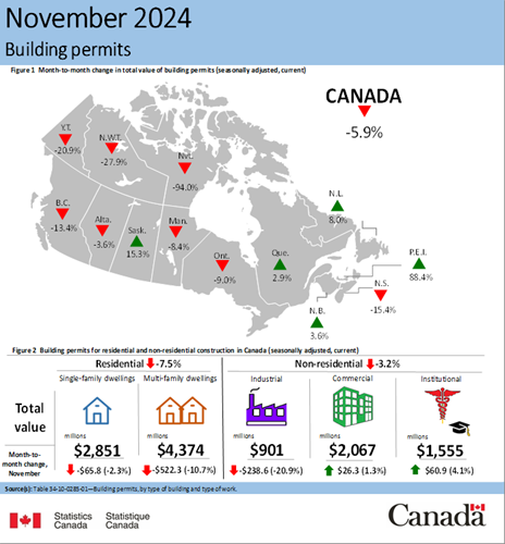 Building permit values dropped by just under 6% in November, reaching $11.7 billion for the month, with both sectors reporting contractions.