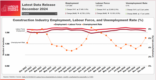Finally, construction unemployment rates in most provinces varied between 5.4% and 6.0% for December 2024, with only three provinces (Saskatchewan, New Brunswick, and Newfoundland and Labrador) reporting rates above the national average of 6.1%.
