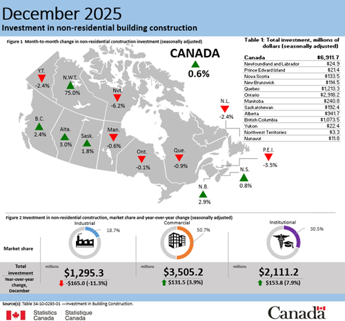 Commercial construction investment rose $43.8 million to $3.5 billion in December. This growth was driven by Alberta (+$20.6 million), followed by Ontario (+$15.7 million) and British Columbia (+$6.4 million). Investment in office building construction led the increase in the commercial component, driven by major projects in the Toronto and Vancouver census metropolitan areas.
