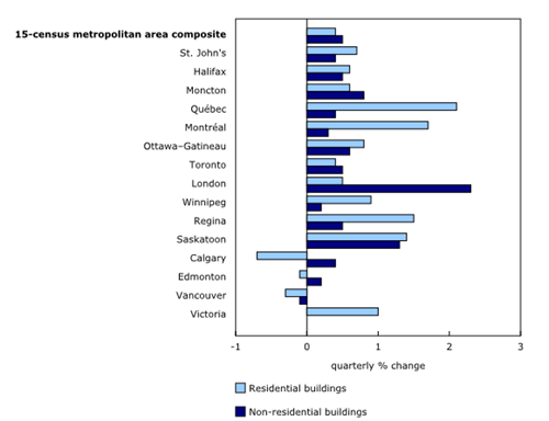 Statistics Canada reports that residential building construction costs increased by 0.4% in the fourth quarter. That followed an increase of 0.6% in the third quarter. Non-residential building construction costs rose 0.5% in the fourth quarter, following a 0.7% increase in the previous quarter.