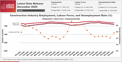 Key construction employment metrics all ended December 2025 at lower levels than in December 2024. A contraction of 9,500 workers in the industry’s labour force more than offset a contraction of 1,500 in the number of employed workers. As a result, the industry’s unemployment rate declined from 6.1% to 5.7%.