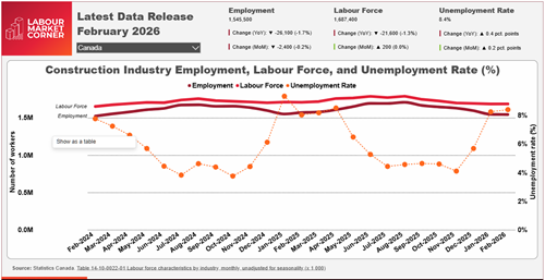 Construction’s key employment indicators declined notably for the 12-month period ending in February 2026. Compared with February 2025, employment retreated by 26,100 workers while the labour force’s decline was more moderate at 21,600 workers. As a result, construction’s unemployment rate rose to 8.4%.